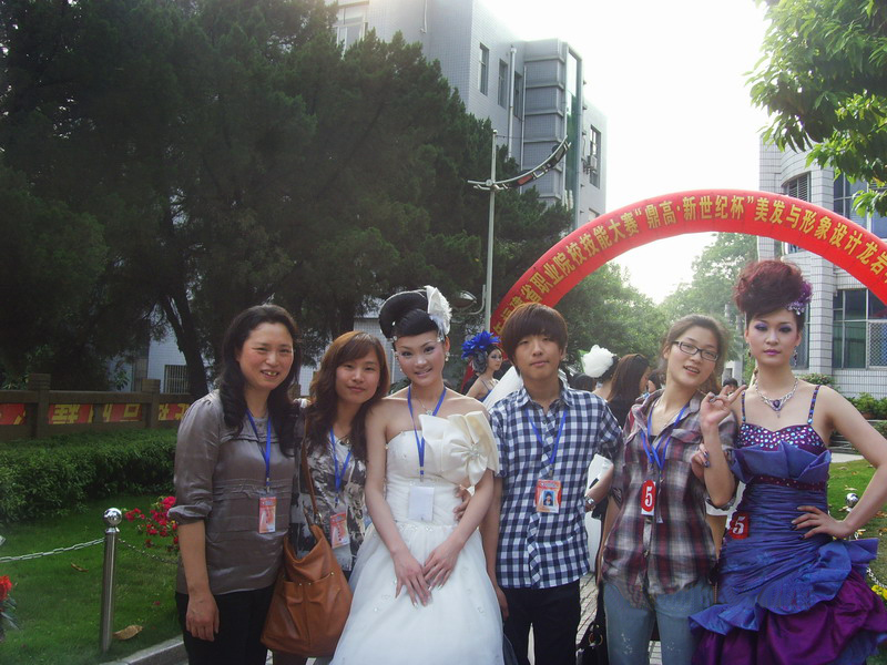 图为参加新娘妆和晚宴妆比赛的指导老师和选手(比赛地点:龙岩)
