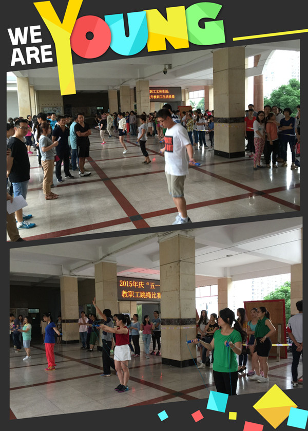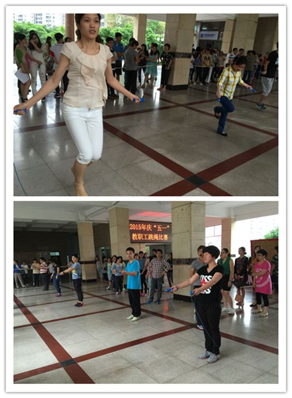 此次跳绳比赛在学校一楼大厅举行,全体教职工齐聚一堂。下午14:40,比赛正式开始。以各工会小组为单位,各自派出10名选手参赛,采取限时计分的办法,互相计数,以小组累计个数的总和排名。大家在活动中跃跃欲试积极参与,并不在意排名的先后,大家更关注活动过程所带来的轻松和快乐。特别是比赛中出现的令人捧腹的小插曲,让大家在哈哈大笑中释放了压力,消除了疲劳,增进了友谊,融洽了氛围。