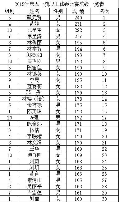 本次跳绳比赛成绩(前30名)如下: