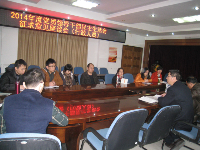 座谈会主要内容有两个:一是学校领导向参会人员通报2013年 度学校党员领导干部民主生活会存在问题整改措施的落实情况以及开展党的群众路线教育实践活动建章立制计划、专项整治等方面的落实情况,参会人员对整改落实情况提出意见和建议并进行满意度测评;二是参会人员对学校领导班子及其本人就坚持原则、敢于担当、遵守党的纪律等方面提出意见建议。