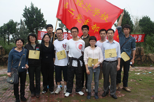 我校5个党支部的50名在职党员、入党积极分子(其中中层党员干部10人)从学校操场鱼贯而出,迅速朝着一个共同的目标——金牛山山顶奋勇前行。整个比赛过程中,党员和入党积极分子充分发扬团结协作的团队精神,队员之间既你追我赶,又齐心协力,不断凝聚起集体的力量,将众志成城、携手争一流的团队精神发挥到极致。最终第二党支部赢得本次团体比赛第一名。男教工党员中率先到达终点的是第三党支部的齐权同志,女教工党员则是第二党支部的林秀丽同志。