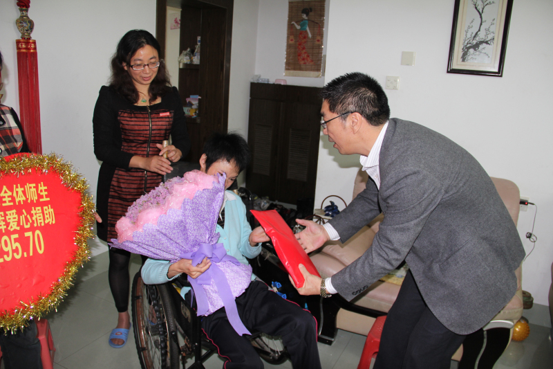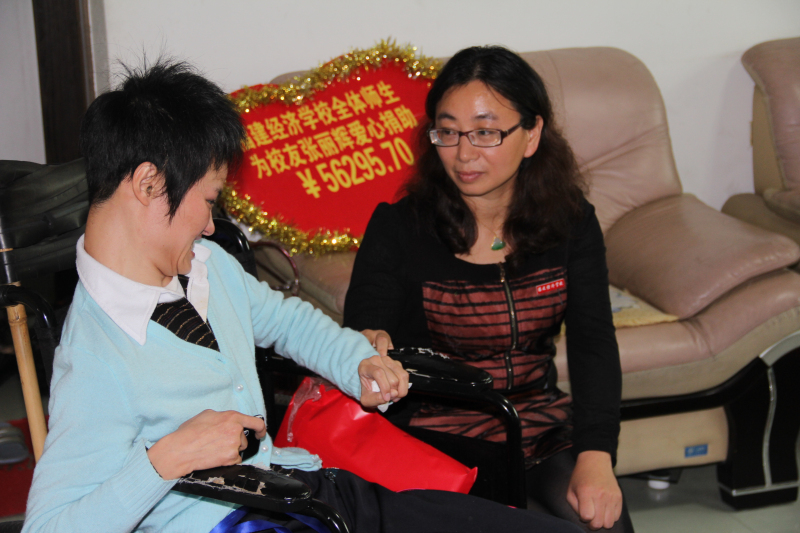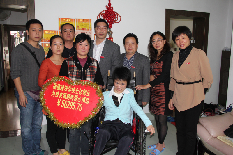 2013年11月14日上午,我校副校长兼工会主席戴健斌、校长助理兰享华、校工会专职副主席曾荔军、校团委书记黄鑫、教学督导室主任陈美珠(95公关班主任)等一行代表学校前往龙岩新罗区,将满载全校师生浓浓深情的爱心捐款56295.7元送到了95公关班校友张丽辉的家中,转达了全校师生的美好祝福。